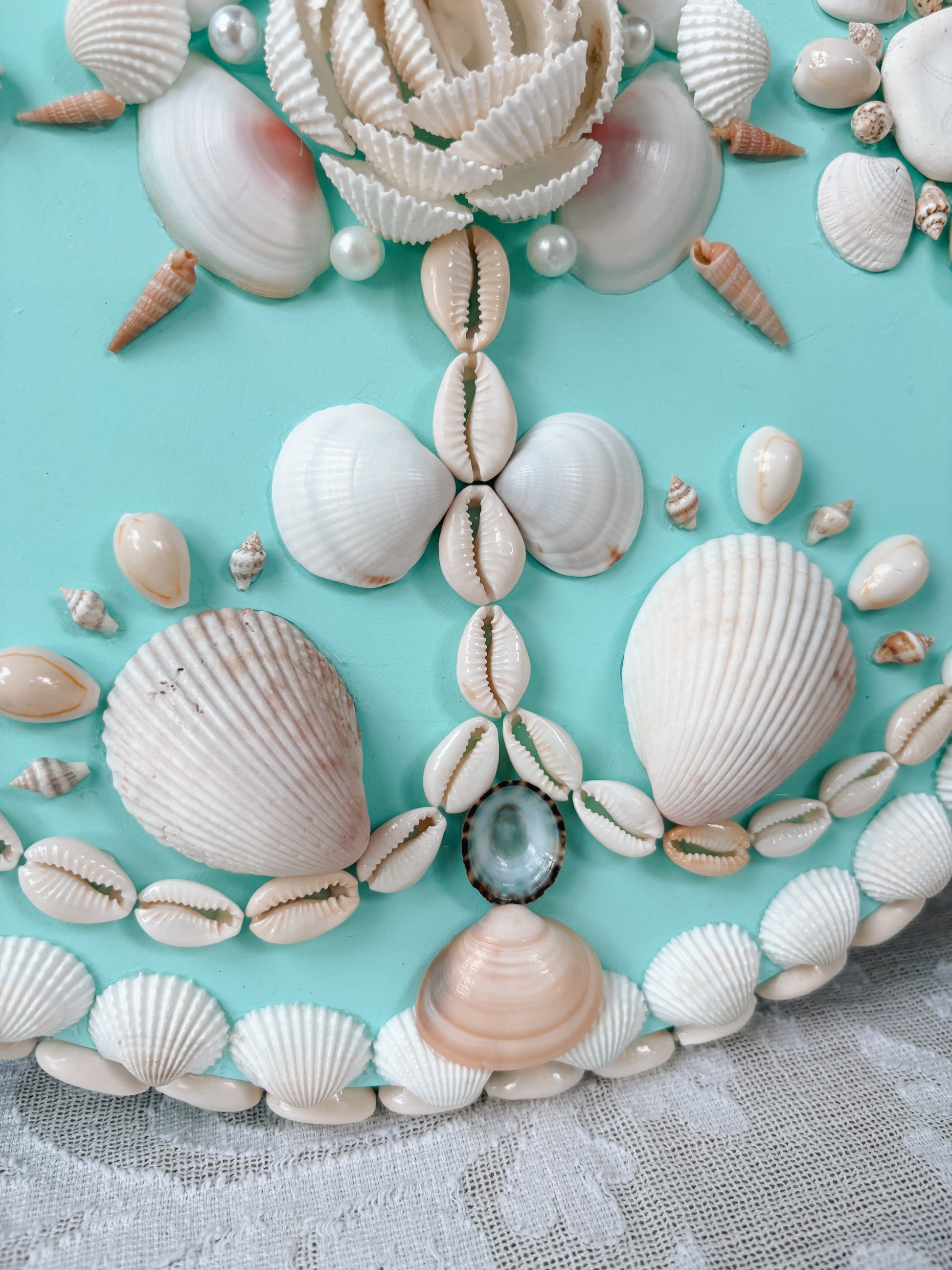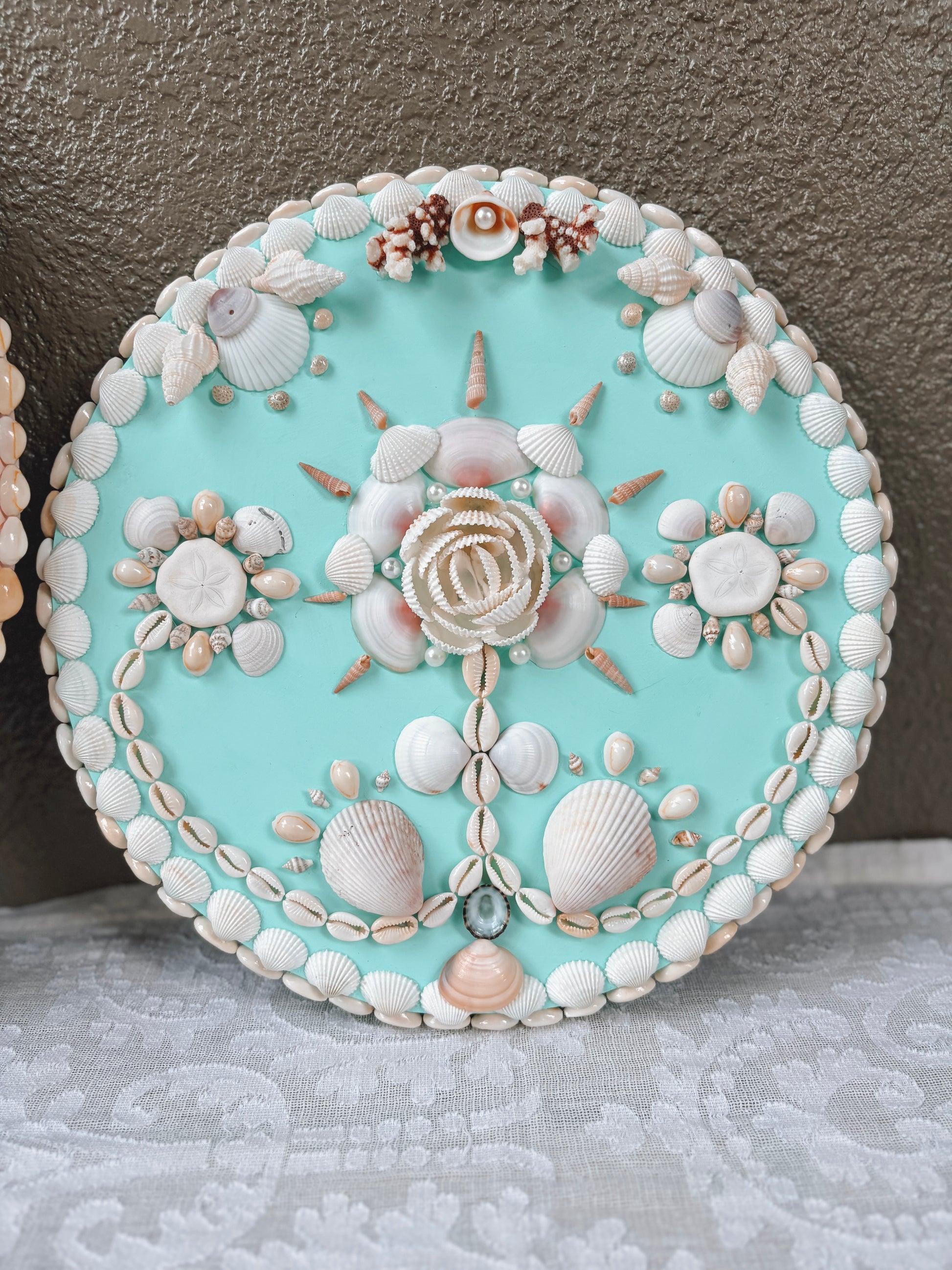 A one-of-a-kind round collector panel adorned with natural shells in coral and ivory tones over a serene Oceana turquoise background. Designed for refined coastal interiors, this 12.5” round shell panel brings organic symmetry and timeless elegance to any space.